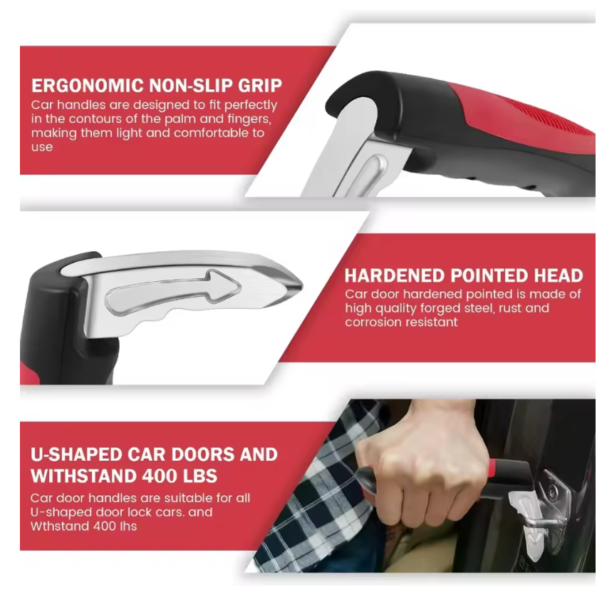 Indsæt krogen i bilens U-formede dørstolpe (sidder i dørkarmen). Tryk ned på håndtaget, indtil det ligger stabilt mod karmen. Brug håndtaget som ekstra støtte, når du sætter dig eller rejser dig. Det er lige så hurtigt at tage af – løft blot op og opbevar det i dørfacket eller handskerummet. Konstruktionen i aluminiumslegering giver høj stabilitet, mens det ergonomiske greb i slidstærk plast giver et sikkert og komfortabelt greb, selv med svag håndstyrke. Mange modeller har også en integreret nød-funktion, der kan bruges som vinduesknuser i en nødsituation.