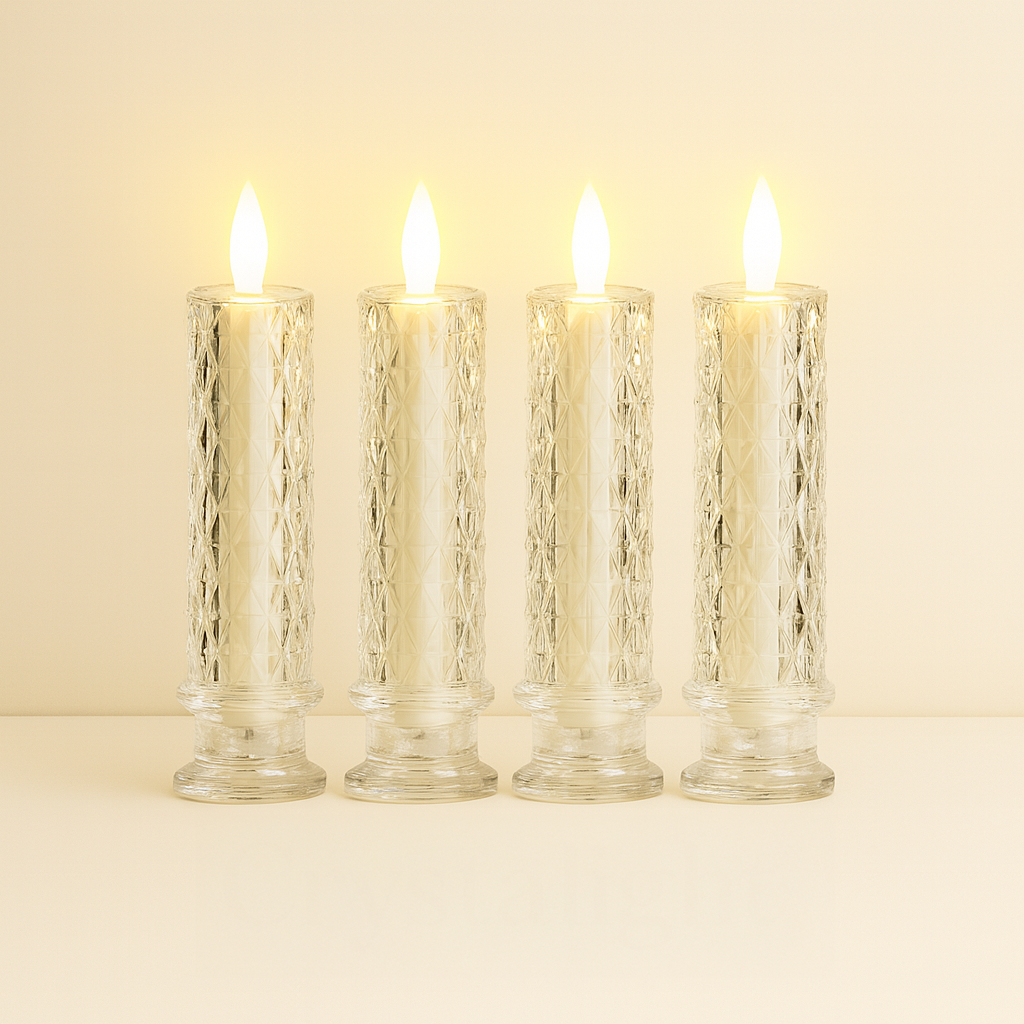 CrystalAura™ er et sæt af fire facetslebne LED-krystal-lys, der øjeblikkeligt løfter borde, soveværelser og festlige begivenheder. Deres juvellignende tekstur spreder blødt lys og skaber en luksuriøs, hyggelig stemning på få sekunder. Elsket af værter, eventstylister og boligindrettere, giver CrystalAura™ skønheden ved levende lys med pålideligheden fra moderne, sikkerhedstestede LED’er.