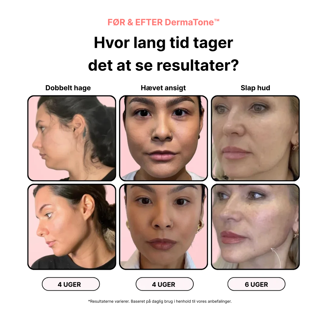 Med DermaTone™ kan du løfte, forme og forfriske dit ansigt på bare få minutter om dagen – helt uden at forlade hjemmet.