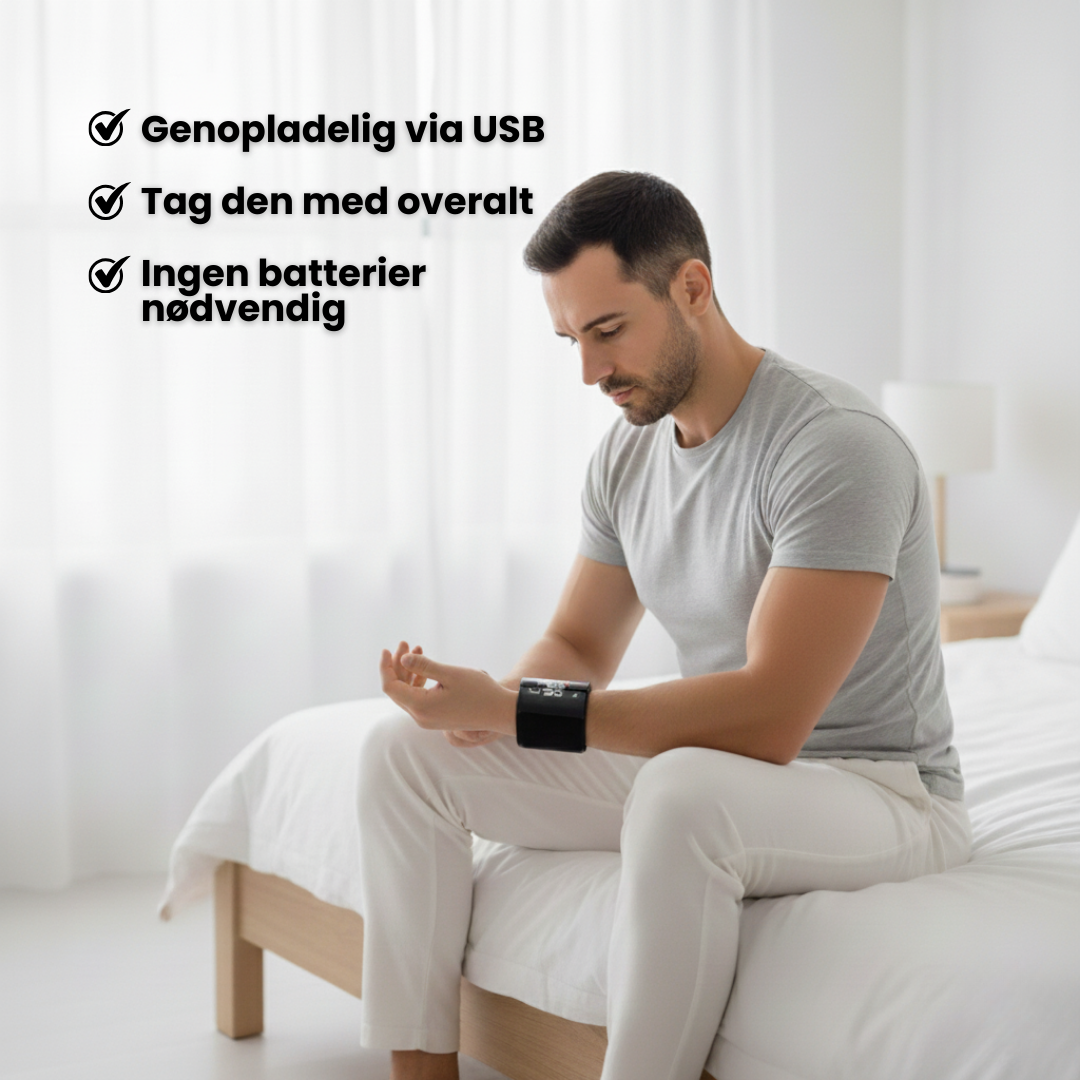 PulseTrack Pro™ er fuldt genopladelig, så du aldrig mere behøver bekymre dig om døde batterier på det forkerte tidspunkt. Det kompakte og lette design gør det let at have med i tasken, på rejser eller på farten. Uanset om du er hjemme, på arbejde eller på ferie, kan du altid få en pålidelig måling.