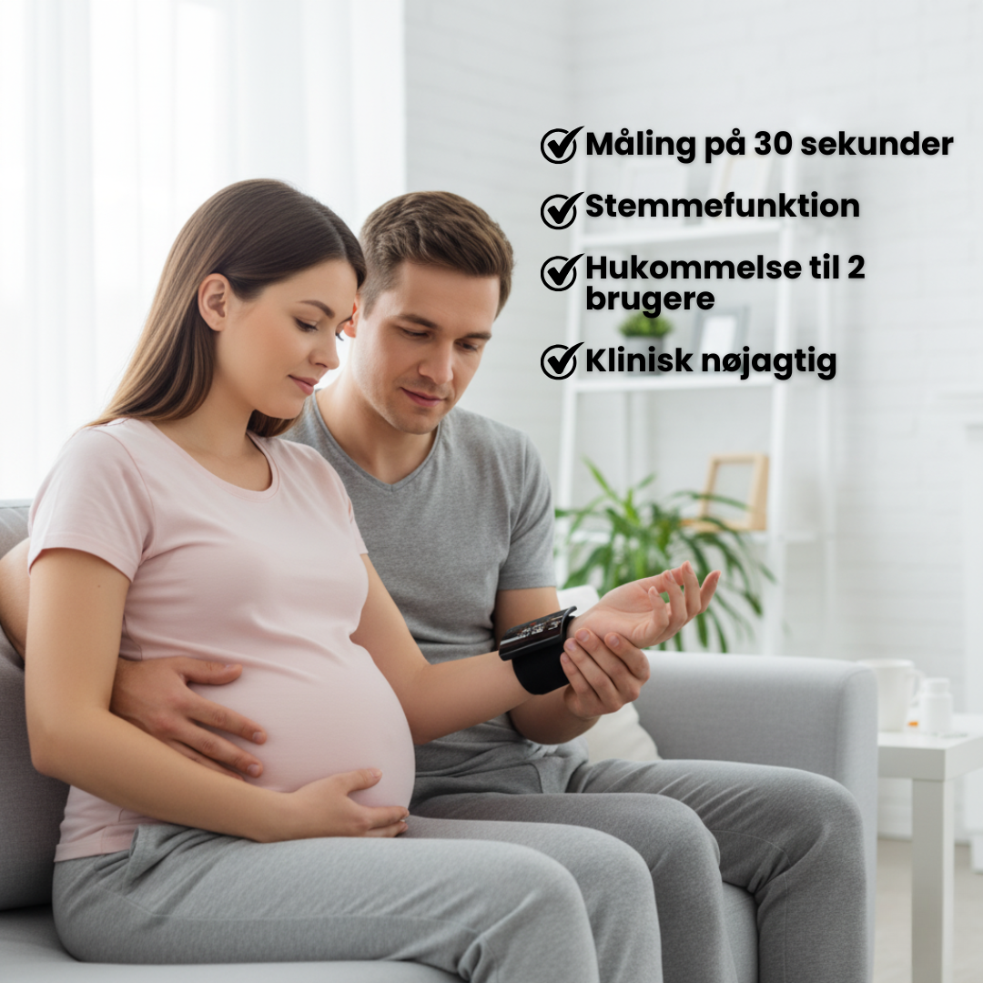 Inden for 30 sekunder viser og læser måleren din fulde blodtryksmåling højt (SYS, DIA og puls). Ét enkelt tryk på knappen — så nemt er det.